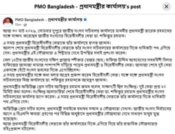 পোস্টে লেখেন, সাক্ষাৎকালে প্রধানমন্ত্রী বিরোধীদলীয় নেতাকে তার কার্যালয়ে স্বাগত জানান। আলোচনা শেষে তিনি বিরোধীদলীয় নেতাকে সংসদ সচিবালয়ের কার্যালয়ের দিকে কিছুটা পথ এগিয়ে দেন, যা উপস্থিতদের মধ্যে প্রশংসা করেন।