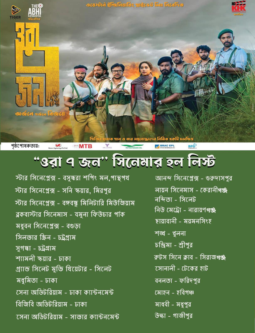 অবশেষে ‘ওরা ৭ জন’ দেশের ২৬টি প্রেক্ষাগৃহ নিশ্চিত করেছে। এ বিষয়ে চ্যানেল আই অনলাইনকে বৃহস্পতিবার দুপুরে নির্মাতা বলেন,‘বহু ঝড়ঝাপ্টার পর এই সংখ্যা। আশা করি আরও দুয়েকটি প্রেক্ষাগৃহ বাড়বে।’