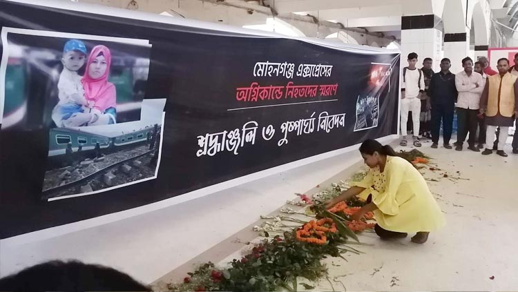 শুক্রবার (২৯ ডিসেম্বর) রাজধানীর কমলাপুর রেলওয়ে স্টেশনে আগুনে নিহতদের স্মরনে শ্রদ্ধাঞ্জলি ও মোমবাতি প্রজ্জলনের আয়োজন করা হয়। ‘নাশকতার বিরুদ্ধে সংক্ষুব্ধ সকল স্তরের জনগণ’-এর ব্যানারে কমলাপুর রেলওয়ে স্টেশনের সাত নম্বর প্লাটফর্মে এ কর্মসূচি পালন করা হয়।
