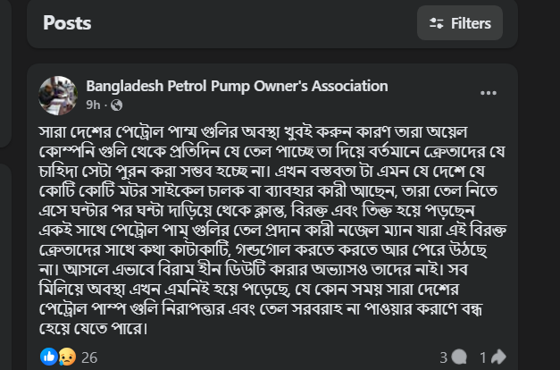 রোববার (২২ মার্চ) রাতে ফেসবুক পোস্টে সংগঠনটি জানায়, বর্তমানে পাম্পগুলোতে সরবরাহকৃত দৈনিক জ্বালানি দিয়ে ক্রেতাদের চাহিদা পূরণ করা সম্ভব হচ্ছে না। এতে মোটরসাইকেলসহ বিভিন্ন যানবাহনের চালকদের ঘণ্টার পর ঘণ্টা লাইনে দাঁড়িয়ে থাকতে হচ্ছে। একই সঙ্গে পাম্পকর্মীরা দীর্ঘ সময় বিরামহীন কাজ করতে গিয়ে শারীরিক ও মানসিক চাপের মুখে পড়ছেন।