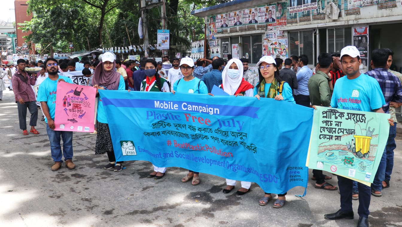 জুলাই মাস প্লাস্টিকমুক্ত পালনের জন্য রাজধানীর ঢাকার বিভিন্ন স্থানে দিনব্যাপী মোবাইল ক্যাম্পেইন আয়োজন করেছে এনভায়রনমেন্ট অ্যান্ড সোশ্যাল ডেভেলপমেন্ট অর্গানাইজেশন (এসডো)।
