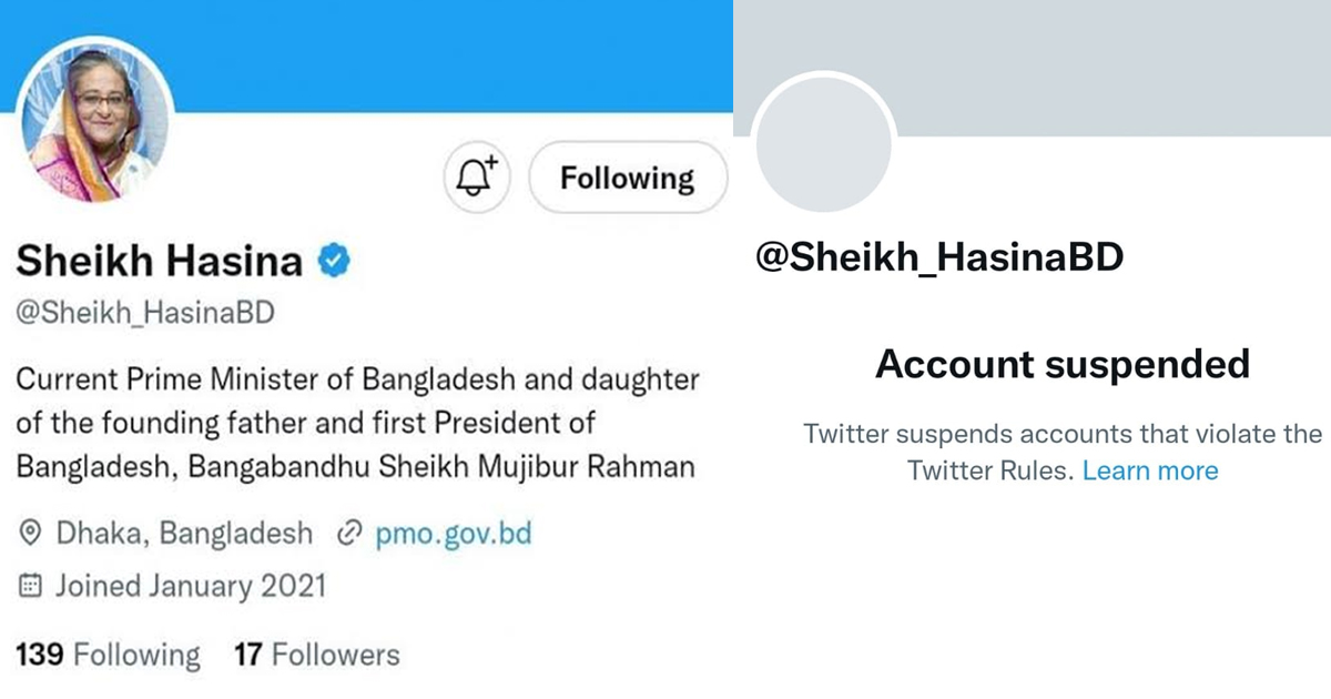 প্রধানমন্ত্রী শেখ হাসিনার নামে থাকা ভেরিফায়েড ভুয়া অ্যাকাউন্টটি সরিয়ে নিয়েছে টুইটার।