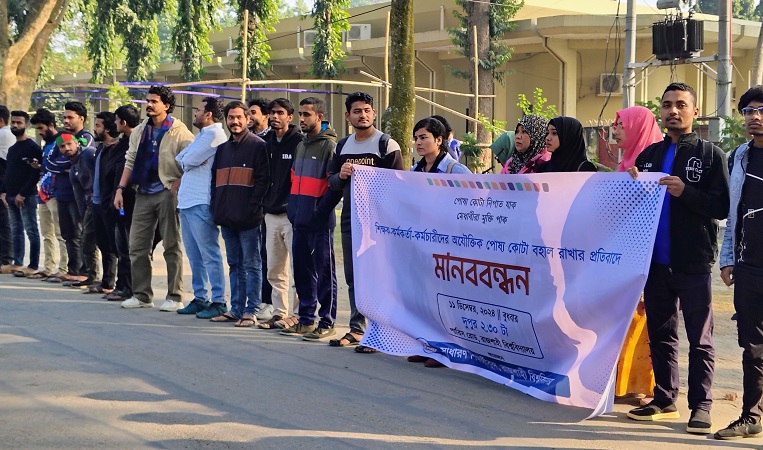 রাজশাহী বিশ্ববিদ্যালয়ে (রাবি) ভর্তি পরিক্ষায় পোষ্য কোটা বহাল রাখার প্রতিবাদে মানববন্ধন করেছে সাধারণ শিক্ষার্থীরা। এসময় তারা একটি সংক্ষিপ্ত প্রতিবাদ সমাবেশও করেছে।