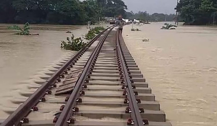 বন্যার পানিতে রেললাইন তলিয়ে যাওয়ায় আজ সকাল থেকে পূর্বাঞ্চলে চট্টগ্রাম-ঢাকাসহ অন্যান্য গন্তব্যের মধ্যে রেল যোগাযোগ বন্ধ হয়ে পড়েছে।