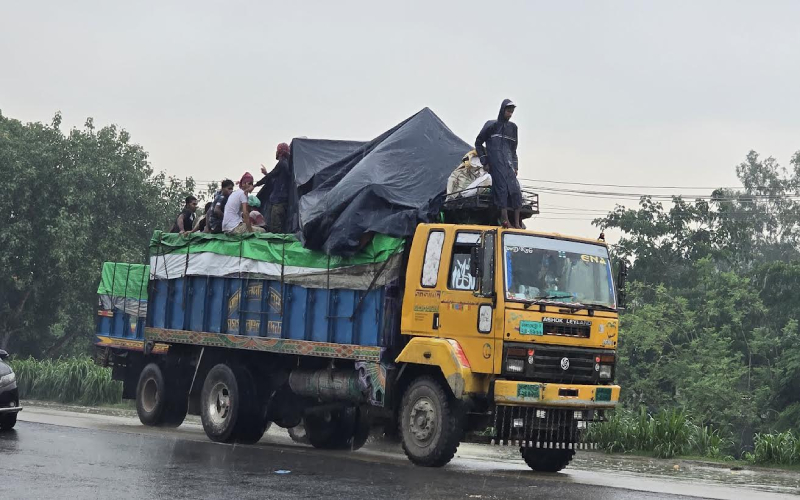 এদিকে বৃষ্টি উপেক্ষা করেই খোলা ট্রাক, পিক আপ, পণ্যবাহী পরিবহন ও বাসের ছাদে চেপে পরিবারের সাথে ঈদের আনন্দ উদযাপন করতে ঢাকা-টাঙ্গাইল পাড়ি দিচ্ছে হাজারো মানুষ। বৃহস্পতিবার ঢাকা-টাঙ্গাইল-যমুনা সেতু মহাসড়কে এমন চিত্র দেখা যায়।