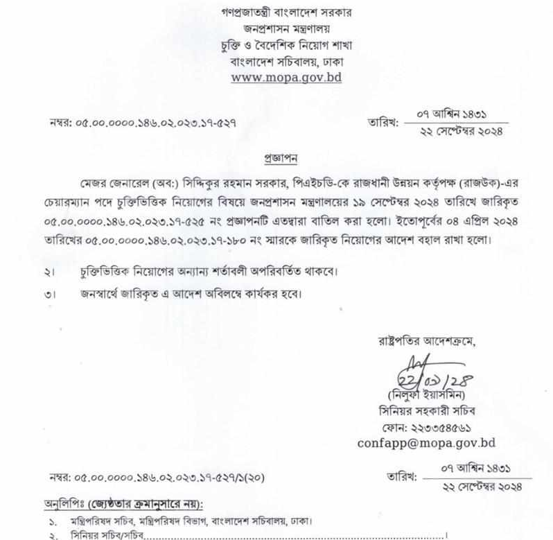 প্রজ্ঞাপনে বলা হয়েছে, অবসরপ্রাপ্ত মেজর জেনারেল মো. ছিদ্দিকুর রহমান সরকারকে রাজধানী উন্নয়ন কর্তৃপক্ষের (রাজউক) চেয়ারম্যান পদে চুক্তিভিত্তিক নিয়োগের বিষয়ে জনপ্রশাসন মন্ত্রণালয়ের ১৯ সেপ্টেম্বরের জারিকৃত প্রজ্ঞাপনটি বাতিল করা হলো।