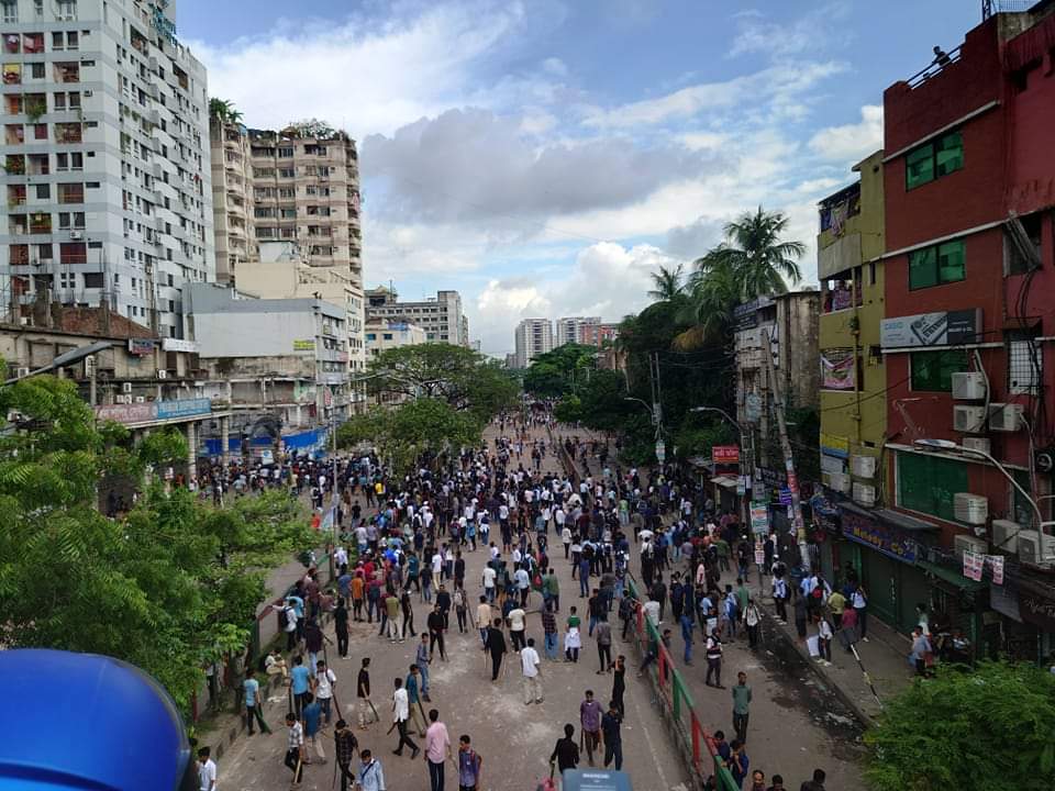 আন্দোলনকারীদের মাঝ থেকে সায়েন্সল্যাব পুলিশ বক্স, টিচার্স ট্রেনিং কলেজের ভবনের গ্লাস ও আশপাশের দোকানের সাটারে আঘাত করতে দেখা যায়৷