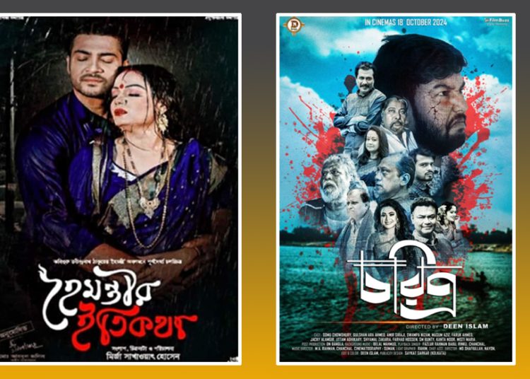 শুক্রবার (১৮ অক্টোবর) দেশের আট প্রেক্ষাগৃহে মুক্তি পেল দুই সিনেমা ‘হৈমন্তীর ইতিকথা’ ও ‘চরিত্র’। কবিগুরু রবীন্দ্রনাথ ঠাকুরের সাহিত্য অবলম্বনে মির্জা সাখাওয়াৎ হোসেন পরিচালনা করেন ‘হৈমন্তীর ইতিকথা’। অন্যটি দ্বীন ইসলাম পরিচালিত সিনেমা ‘চরিত্র’। দুটি সিনেমাই চারটি করে ৮টি প্রেক্ষাগৃহে মুক্তি পেয়েছে।