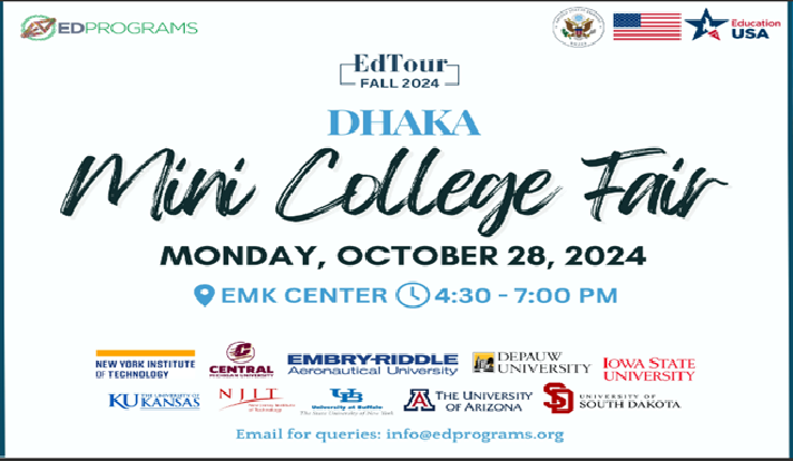 এটি বাংলাদেশের শিক্ষার্থীদের জন্য একটি বিশেষ সুযোগ, যেখানে তারা সরাসরি যুক্তরাষ্ট্রের বিশ্ববিদ্যালয়ের প্রতিনিধিদের সঙ্গে যোগাযোগ করে ভর্তিতে কী কী প্রয়োজন, বৃত্তির সুযোগ এবং কীভাবে কার্যকরী আবেদন জমা দেওয়া যায় সে সম্পর্কে পরামর্শ নিতে পারবেন। মেলায় অংশগ্রহণ করতে ২৬ অক্টোবরের মধ্যে নিবন্ধন সম্পন্ন করতে হবে। নিবন্ধন লিংক- https://forms.gle/XfDa5UzDDmbJvgvL6।