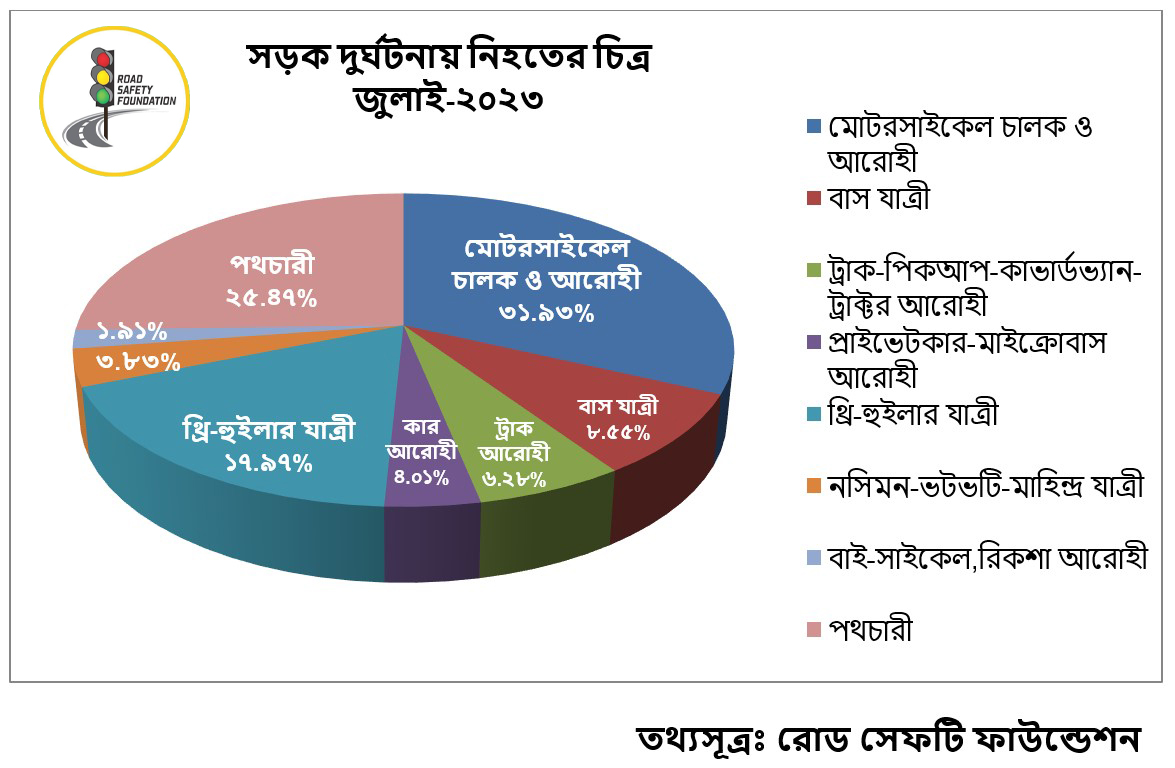 বিজ্ঞপ্তিতে জানানো হয়,  ১৮৮টি মোটরসাইকেল দুর্ঘটনায় নিহত হয়েছেন ১৮৩ জন, যা মোট নিহতের ৩১ দশমিক ৯৩ শতাংশ। মোটরসাইকেল দুর্ঘটনার হার ৩৬ দশমিক ৭৯ শতাংশ। দুর্ঘটনায় ১৪৬ জন পথচারী নিহত হয়েছে, যা মোট নিহতের ২৫ দশমিক ৪৭ শতাংশ। যানবাহনের চালক ও সহকারী নিহত হয়েছেন ৭৮ জন, অর্থাৎ ১৩ দশমিক ৬১ শতাংশ।