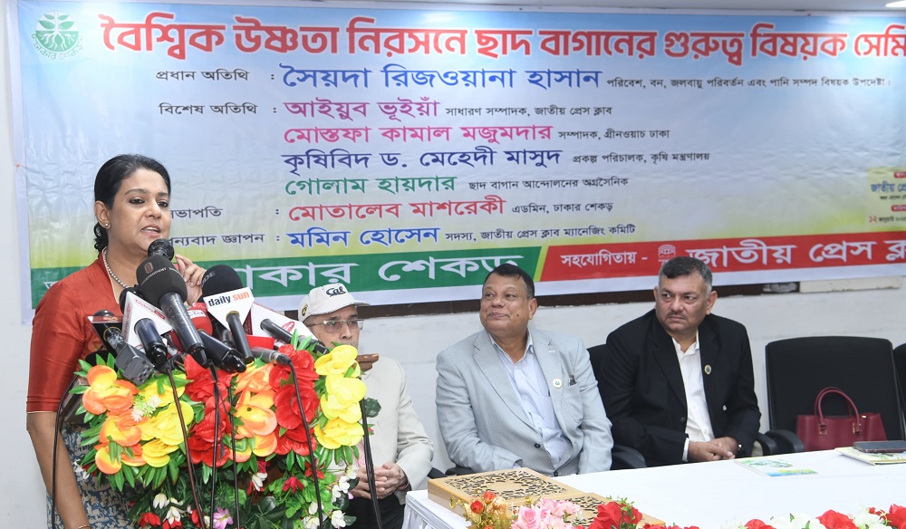 আজ রোববার জাতীয় প্রেসক্লাবে “বৈশ্বিক উষ্ণতা নিরসনে ছাদ বাগানের গুরুত্ব” শীর্ষক সেমিনারে প্রধান অতিথির বক্তব্যে পরিবেশ উপদেষ্টা এসব কথা বলেন।