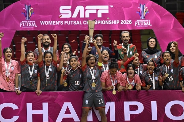 সাফ ফুটসাল চ্যাম্পিয়নশিপের প্রথম আসরে খালি হাতে ফিরেছে ছেলেদের বাংলাদেশ দল। বিপরীত উজ্জ্বল ছিলেন মেয়েরা। টুর্নামেন্টের প্রথম আসরেই চ্যাম্পিয়ন হয়েছে সাবিনা খাতুনের দল। শিরোপা জিতে দেশে ফিরছেন লাল-সবুজের প্রতিনিধিরা।