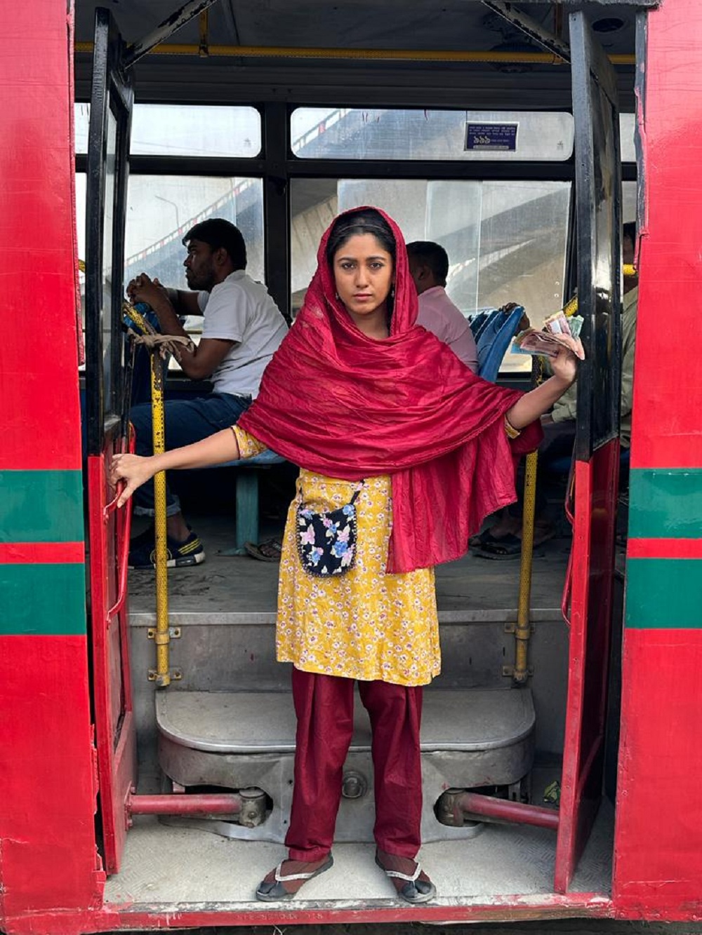 মেরুন-হলুদ সালোয়ার কামিজ পরে বাসের গেটে দাঁড়িয়ে আছেন সাফা কবির। যাত্রীদের বাসে ওঠার ডাক দিচ্ছেন। তার পায়ে স্যান্ডেল, গলায় ঝুলছে কাপড়ের ভ্যাটিনি ব্যাগ। চেহারার উজ্জ্বলতা নেই। হাতে আঙুলে ১০, ২০, ৫০, ১০০ টাকার নোট। বোঝা যাচ্ছে সাফা বাসের হেলপার!