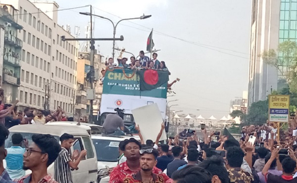 শেষ খবর, ধীরে ধীরে এগোচ্ছে বাস। চ্যাম্পিয়ন মেয়েদের বরণ করতে রাস্তার দুপাশেই দেখা মিলছে ভক্ত-সমর্থকদের উপচে পড়া ভিড়। সবচেয়ে বেশি মানুষের উপস্থিতি মিলেছে খিলক্ষেত ও বনানী এলাকায়। তারা স্লোগান দিয়ে, ফুল ছিটিয়ে মেয়েদের রাজসিকভাবে বরণ করে নিচ্ছে। হাত নাড়িয়ে সমর্থকদের অভিবাদন গ্রহণ করেছেন সাফজয়ী মেয়েরাও।