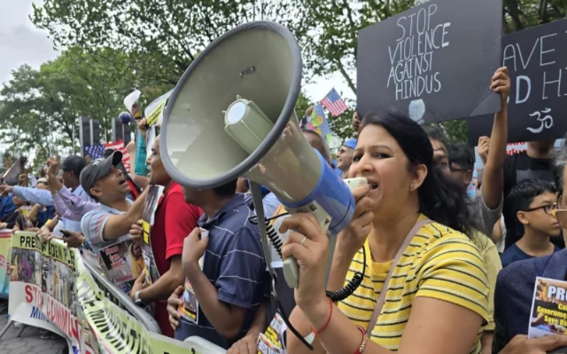 শেখ হাসিনা সরকারের পতনের পর বাংলাদেশের বিভিন্ন স্থানে সংখ্যালঘুদের বাড়িঘর-ব্যবসাপ্রতিষ্ঠানে লুটপাট-অগ্নিসংযোগ,মন্দিরে ভাঙচুরসহ নির্যাতনের প্রতিবাদে নিউইয়র্কে জাতিসংঘ সদর দপ্তরের সামনে প্রবাসী সনাতন ধর্মাবলম্বীরা সমাবেশ করেছেন।
