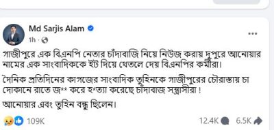 সার্জিস আলম বলেন, গাজীপুরে এক বিএনপি নেতার চাঁদাবাজি নিয়ে নিউজ করায় দুপুরে আনোয়ার নামের এক সাংবাদিককে ইট দিয়ে থেঁতলে দেয় বিএনপির কর্মীরা। দৈনিক প্রতিদিনের কাগজের সাংবাদিক তুহিনকে গাজীপুরের চৌরাস্তায় চায়ের দোকানে রাতে জবাই করে হত্যা করেছে চাঁদাবাজ সন্ত্রাসীরা।