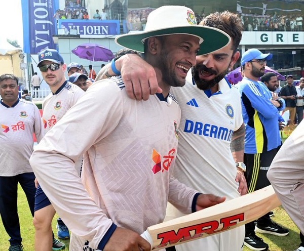 কানপুরেই ক্যারিয়ারের শেষ টেস্ট খেলে ফেলেছেন সাকিব আল হাসান, প্রশ্ন থেকে যাচ্ছে এমনটাই। মিরপুরে আসন্ন সাউথ আফ্রিকা সিরিজে সাদা পোশাকের ক্যারিয়ারে ইতি টানতে চেয়েছিলেন। তবে টাইগার অলরাউন্ডারের সেই আশা পূর্ণ হওয়া এখন জটিলই বটে। যদিও বা, মিরপুরে খেলার ‍সুযোগ মেলে তবে বিদেশের মাটিতে সাকিবের শেষ টেস্ট এটি। আর তাইতো বাংলাদেশের কিংবদন্তি ক্রিকেটারকে ‘ট্রিবিউট’ জানালেন ভারতের কিংবদন্তি ব্যাটার বিরাট কোহলি।