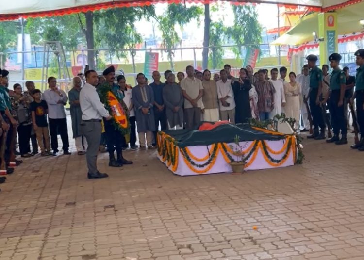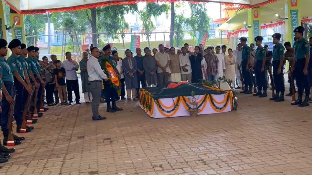 এরপর ঢাকা জেলা প্রশাসনের পক্ষ থেকে এই গীতিকার ও সুরকারের কফিন মুড়িয়ে দেওয়া হয় জাতীয় পতাকায়। পুলিশের একটি দল সেখান এই শিল্পীকে গার্ড অব অনার দেন। এসময় বিউগলে বাজানো হয় করুণ সুর।