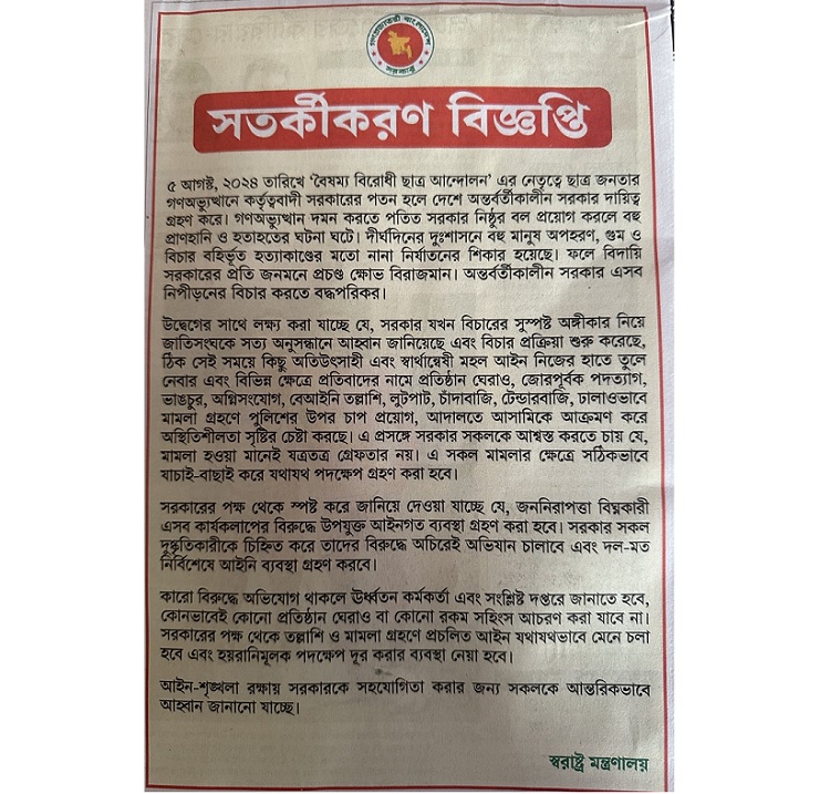বিজ্ঞপ্তিতে বলা হয়, ৫ আগস্ট, ২০২৪ তারিখে ‘বৈষম্য বিরোধী ছাত্র আন্দোলন’ এর নেতৃত্বে ছাত্র জনতার গণঅভ্যুত্থানে কর্তৃত্ববাদী সরকারের পতন হলে দেশে অন্তর্বর্তীকালীন সরকার দায়িত্ব গ্রহণ করে। গণঅভ্যুত্থান দমন করতে পতিত সরকার নিষ্ঠুর বল প্রয়োগ করলে বহু প্রাণহানি ও হতাহতের ঘটনা ঘটে। দীর্ঘদিনের দুঃশাসনে বহু মানুষ অপহরণ, গুম ও বিচার বহির্ভূত হত্যাকাণ্ডের মতো নানা নির্যাতনের শিকার হয়েছে। ফলে বিদায়ি সরকারের প্রতি জনমনে প্রচণ্ড ক্ষোভ বিরাজমান। অন্তর্বর্তীকালীন সরকার এসব নিপীড়নের বিচার করতে বদ্ধপরিকর।
