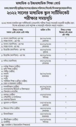 চলতি বছরের মাধ্যমিক স্কুল সার্টিফিকেট (এসএসসি) পরীক্ষার সময়সূচি প্রকাশ করা হয়েছে। শনিবার রুটিন প্রকাশ করে মাধ্যমিক ও উচ্চমাধ্যমিক শিক্ষা বোর্ড।