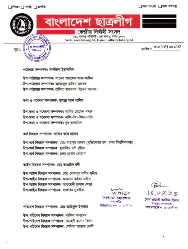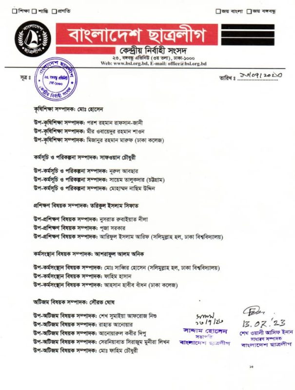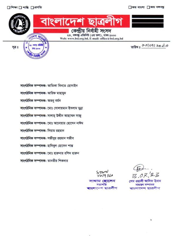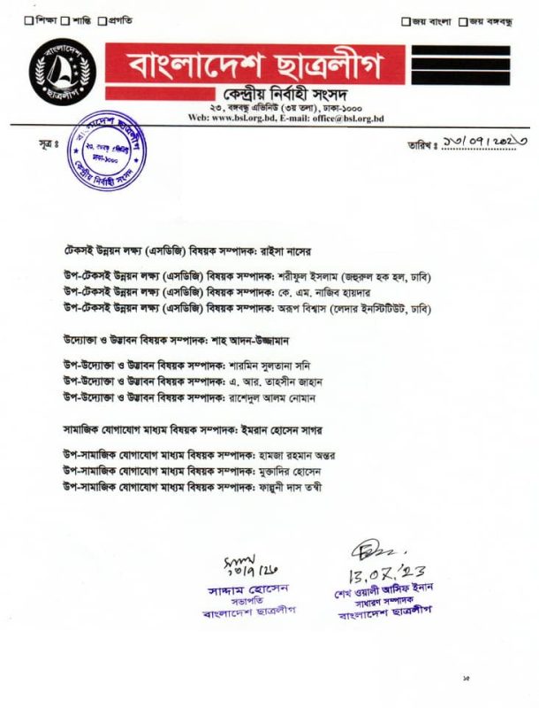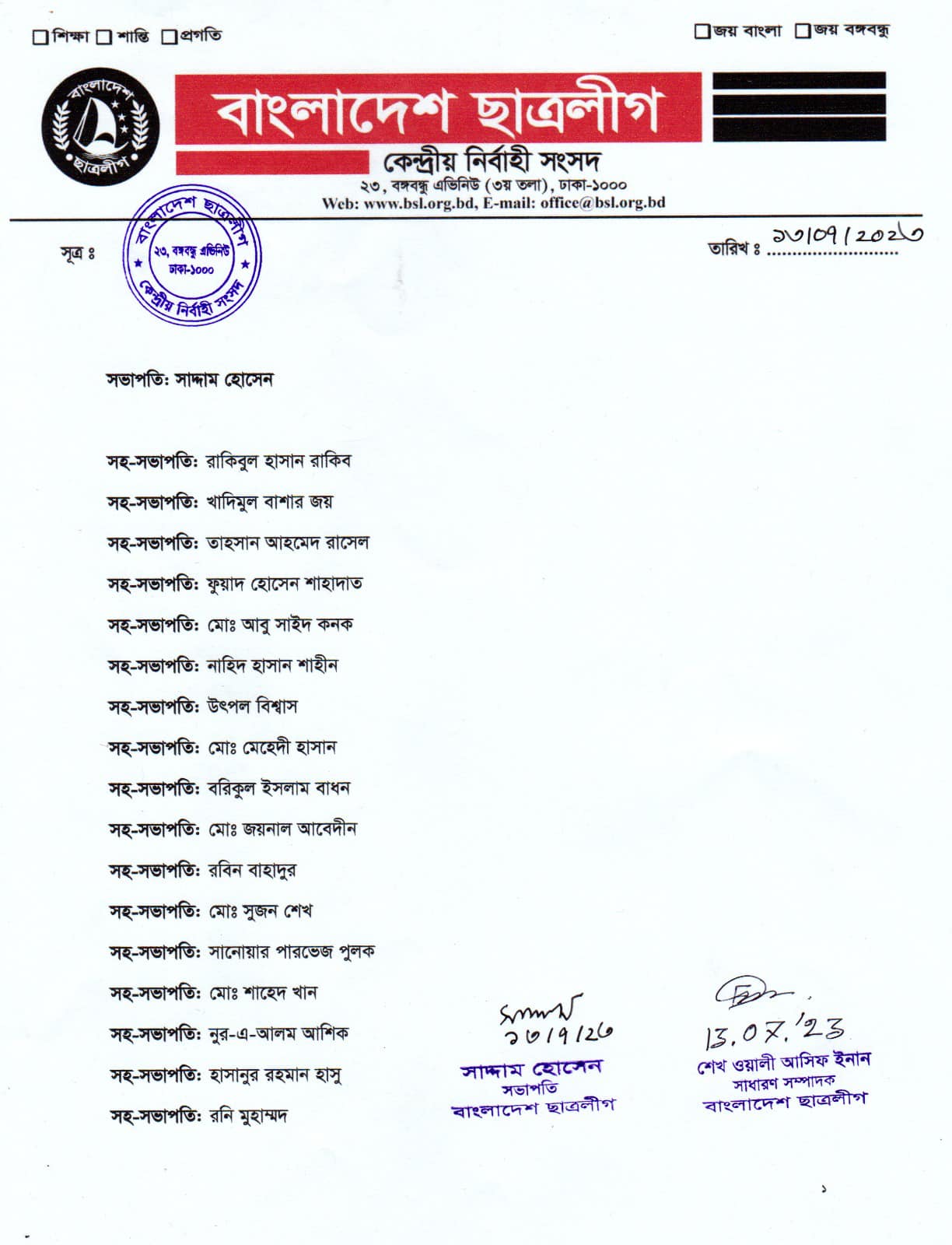 ক্ষমতাসীন দল আওয়ামী লীগের ছাত্র সংগঠন বাংলাদেশ ছাত্রলীগের পূর্ণাঙ্গ কেন্দ্রীয় কমিটি ঘোষণা করা হয়েছে। বৃহস্পতিবার (১৩ জুলাই) কেন্দ্রীয় ছাত্রলীগের সভাপতি সাদ্দাম হোসেন ও সাধারণ সম্পাদক শেখ ওয়ালী আসিফ ইনান সাক্ষরিত এক বিজ্ঞপ্তিতে পূর্ণাঙ্গ কমিটি ঘোষণা করা হয়।