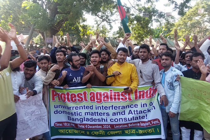 ভারতের আগরতলায় বাংলাদেশের সহকারী হাইকমিশনে হামলা ও বিলোনিয়া সীমান্তে ভারতীয়দের বাংলাদেশ বিরোধী স্লোগান ও বিক্ষোভ কার্যক্রমের প্রতিবাদে ফেনীতে বিক্ষোভ মিছিল ও সমাবেশ করেছে বৈষম্যবিরোধী ছাত্র আন্দোলনের শিক্ষার্থী ও সচেতন জনতা।