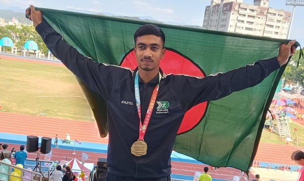 তাইওয়ানে চলছে ন্যাশনাল স্কুল অ্যাথলেটিকস চ্যাম্পিয়নশিপ-২০২৪ আসর। আসরে ট্রিপল জাম্পে স্বর্ণপদক জিতেছেন বাংলাদেশের তামিম হোসেন। প্রতিযোগিতায় ১৪.৭৭ মিটার লাফিয়ে স্বর্ণ নিশ্চিত করেন বাংলাদেশ ক্রীড়া শিক্ষা প্রতিষ্ঠানের উঠতি তারকা অ্যাথলেট।