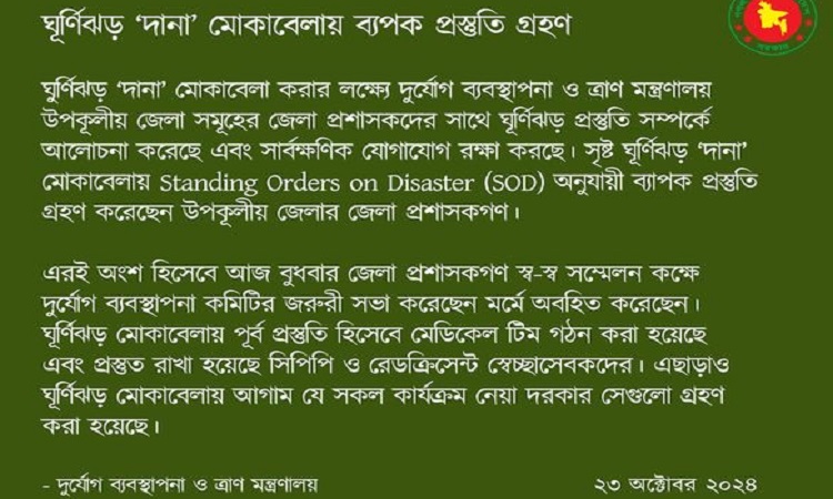 ঘুর্ণিঝড় ‘দানা’ মোকাবেলা করার লক্ষ্যে দুর্যোগ ব্যবস্থাপনা ও ত্রাণ মন্ত্রণালয় উপকূলীয় জেলা সমূহের জেলা প্রশাসকদের সাথে ঘূর্ণিঝড় প্রস্তুতি সম্পর্কে আলোচনা করেছে এবং সার্বক্ষণিক যোগাযোগ রক্ষা করছে। সৃষ্ট ঘূর্ণিঝড় ‘দানা’ মোকাবেলায় Standing Orders on Disaster (SOD) অনুযায়ী ব্যাপক প্রস্তুতি গ্রহণ করেছেন উপকূলীয় জেলার জেলা প্রশাসকগণ।
