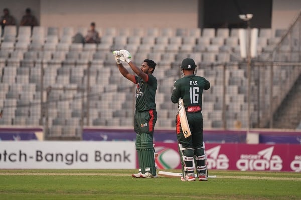 উদ্বোধনীতে বাংলাদেশকে ভালো শুরু এনে দেন তানজিদ তামিম ও সাইফ হাসান। ১০৫ রান তোলেন দুজনে। ১৮.১ ওভারে সাইফ আউট হলে জুটি ভাঙে। ৩ চারে ৫৫ বলে ৩৬ রান করেন সাইফ। দ্বিতীয় উইকেটে নাজমুল হোসেন শান্ত ও তানজিদ মিলে যোগ করেন ৫৩ রান। শান্ত ৩ চারে ৩৪ বলে ২৭ রানে আউট হন।