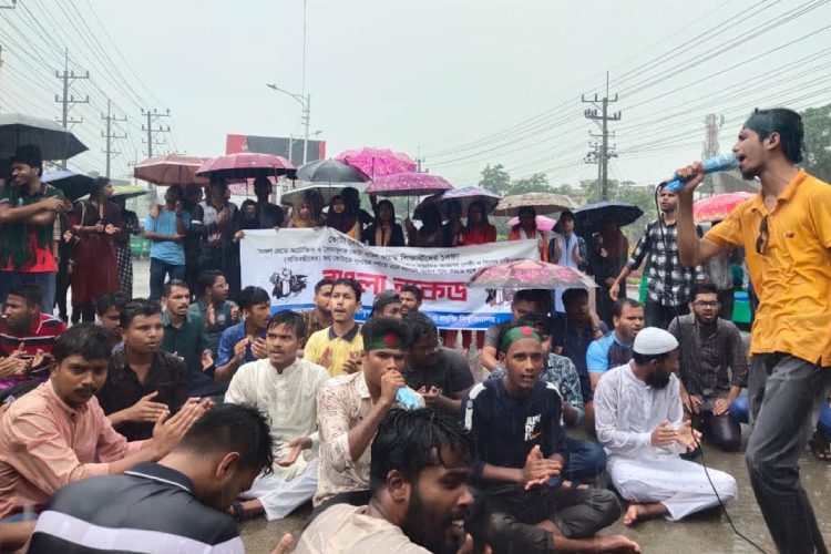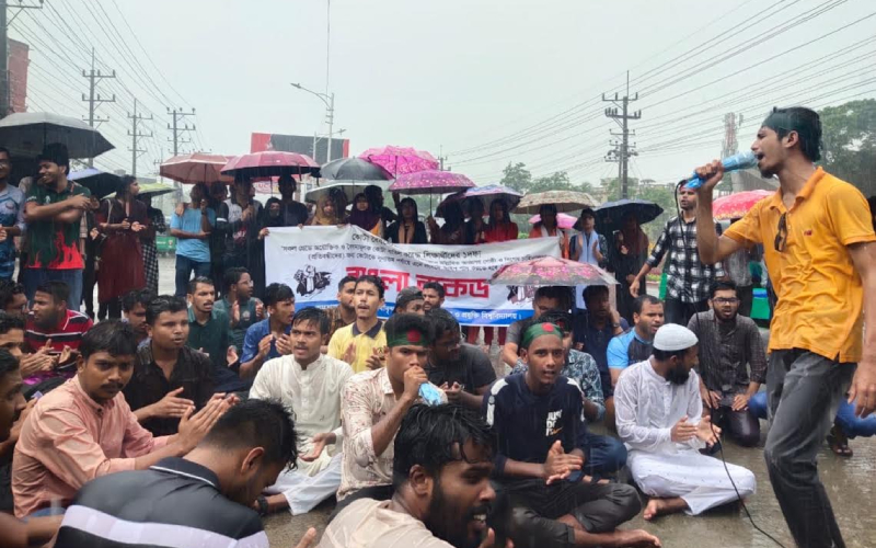 এক দফা দাবিতে বাংলা ব্লকেড কর্মসূচি পালন করছে সিলেটের শাহজালাল বিজ্ঞান ও প্রযুক্তি বিশ্ববিদ্যালয়ের (শাবিপ্রবি) শিক্ষার্থীরা। বেলা ১২টা থেকে বিশ্ববিদ্যালয়ের বিভিন্ন গুরুত্বপূর্ণ সড়ক প্রদক্ষিণ করার পর বিশ্ববিদ্যালয়ের প্রধান ফটকের সামনে সিলেট-সুনামগঞ্জ মহাসড়ক অবরোধ করে বাংলা ব্লকেড কর্মসূচি পালন করেন শিক্ষার্থীরা। এসময় বৃষ্টি এলে ছাতাসহ বা ছাতা ছাড়াই কর্মসূচি পালন করতে দেখা যায় শিক্ষার্থীদের।