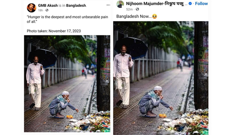 সম্প্রতি ফুটপাতে ময়লার ভাগাড় থেকে একজন বৃদ্ধের উচ্ছিষ্ট কুড়িয়ে খাওয়ার একটি ছবি সামাজিক যোগাযোগমাধ্যমে ছড়িয়ে পড়েছে। ‘দুর্ভিক্ষের বাংলাদেশ’ এবং ‘বাংলাদেশের অবস্থা’ শীর্ষক ক্যাপশনে ছবিটি পোস্ট করে দাবি করা হচ্ছে, এটি সাম্প্রতিক বাংলাদেশের ছবি।