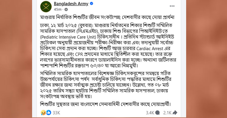 ফেসবুক পেজের ওই পোস্টে বলা হয়, ঢাকার সম্মিলিত সামরিক হাসপাতালের (সিএমএইচ) শিশু বিভাগের পেডিয়াট্রিক ইনটেনসিভ কেয়ার ইউনিটে (পিআইসিইউ) শিশুটি চিকিৎসাধীন। প্রতিদিন স্ট্যান্ডার্ড আইসিইউ প্রটোকল অনুযায়ী প্রয়োজনীয় পরীক্ষা-নিরীক্ষা করা এবং তদানুযায়ী সর্বোচ্চ চিকিৎসা সেবা দেয়া হচ্ছে।