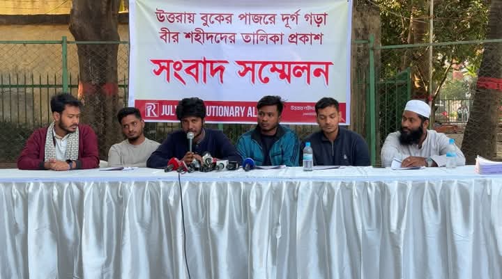 জুলাই বিপ্লবে রাজধানীর উত্তরায় ১৮ জুলাই থেকে ৫ আগস্ট পর্যন্ত শহীদ ৯২ জনের তালিকা প্রকাশ করেছে জুলাই রেভ্যুলেশনারি এলায়েন্স।