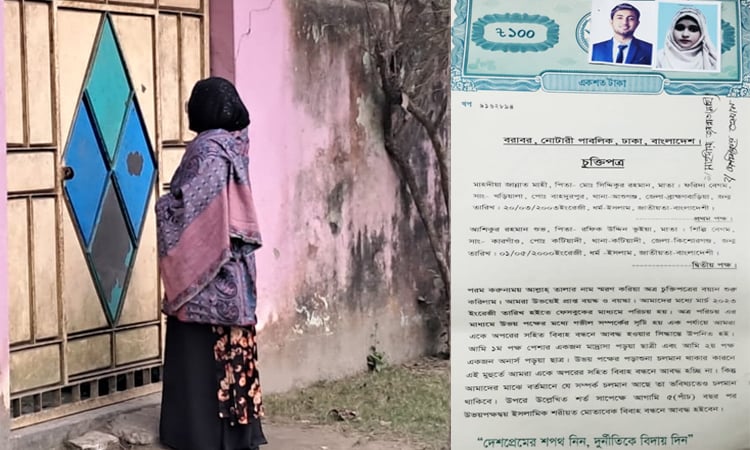 তিনশত টাকার দলিলে চুক্তি করেও প্রেম টিকাতে পারলেন না ঢাকার একটি মাদ্রাসায় শিক্ষকতা করা প্রেমিকা। স্ত্রীর দাবি নিয়ে প্রেমিকের বাড়িতে আসলে সম্পর্ক অস্বীকার করে বলে জানায় ভুক্তভোগী। ফলে গত তিন দিন যাবৎ কিশোরগঞ্জ পৌর শহরের পূর্ব তারাপাসা এলাকার আজগর আলির ছেলে প্রেমিক আশিকুর রহমান শুভর বাড়ির সামনে এসে অনশন করছেন তিনি।
