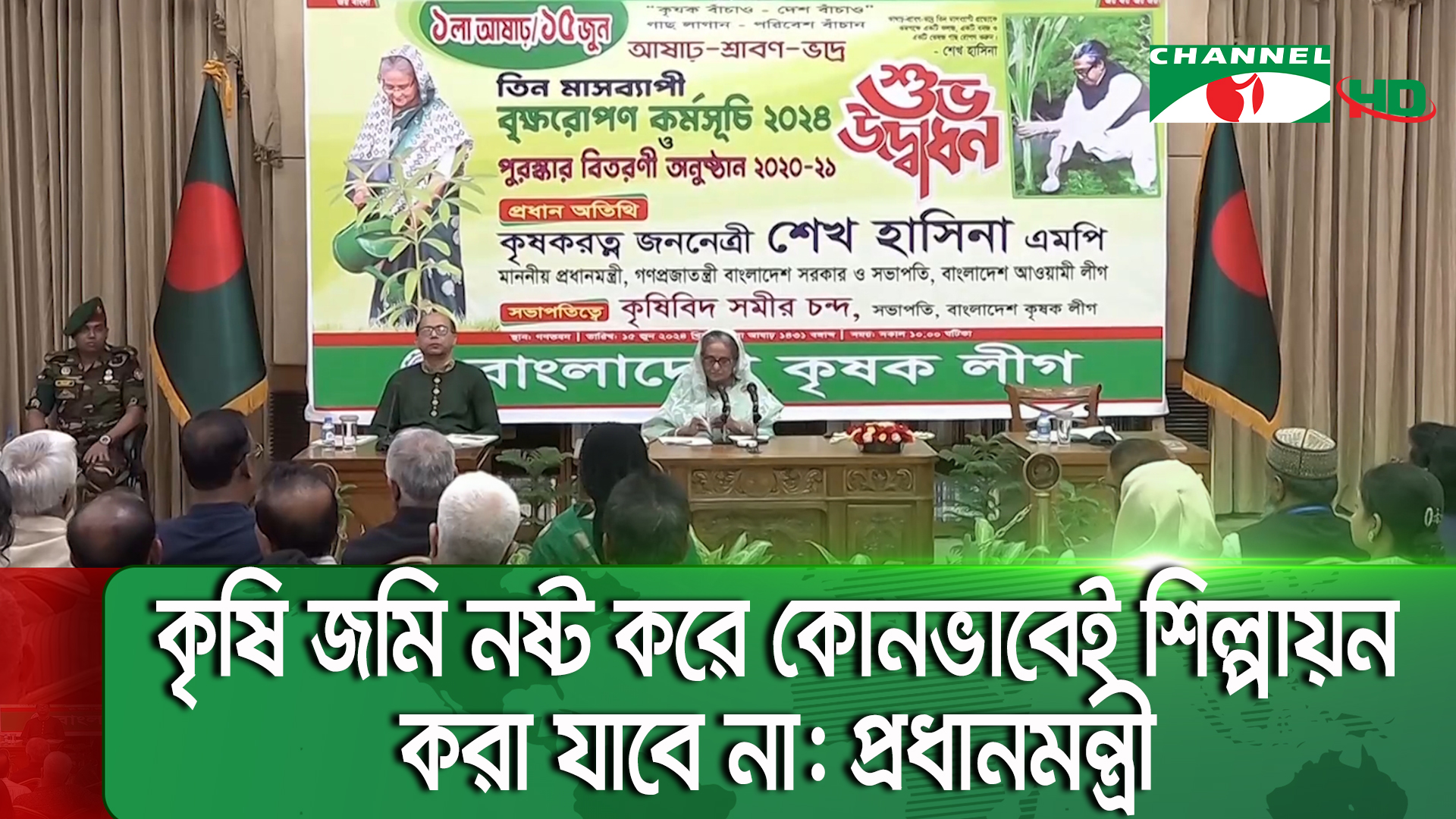 মানুষের চাহিদার দিকে লক্ষ্য রেখে ফসল উৎপাদন বাড়ানোর তাগিদ দিয়ে প্রধানমন্ত্রী শেখ হাসিনা বলেছেন, কৃষি জমি নষ্ট করে কোনভাবেই শিল্পায়ন করা যাবে না। কৃষক লীগ আয়োজিত তিন মাসের বৃক্ষরোপণ কর্মসূচি ও পুরস্কার বিতরণী অনুষ্ঠানে প্রধানমন্ত্রী বলেন, নির্বাচনকে প্রহসন বানিয়েছিলো বিএনপি, সেই বিএনপি নির্বাচন নিয়ে কথা বললে হাসি পায়।