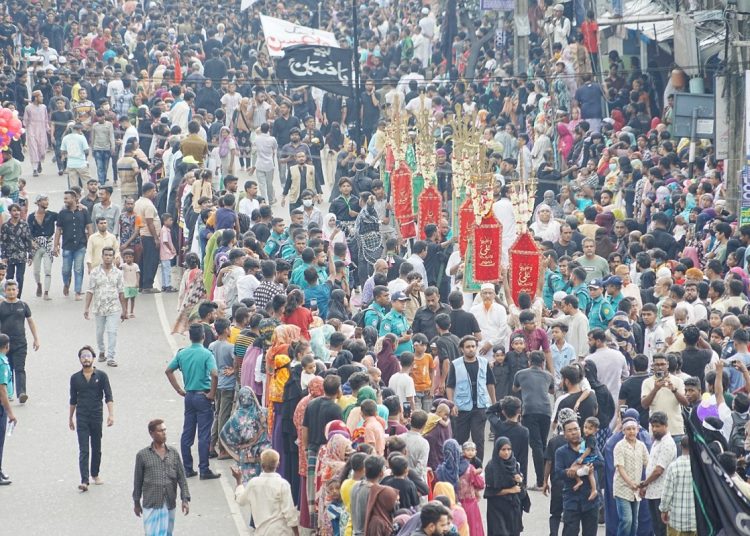 নিশ্ছিদ্র নিরাপত্তাবলয়ের মধ্য দিয়ে পবিত্র আশুরা উপলক্ষে রাজধানীতে শোকাবহ তাজিয়া মিছিল অনুষ্ঠিত হয়েছে। ভোর থেকেই কালো পোশাকে, হাতে লাল-কালো-সোনালি রঙের ঝান্ডা নিয়ে হোসনি দালানে জড়ো হন হাজারো নারী-পুরুষ। চারপাশজুড়ে ভেসে বেড়ায় ‘হায় হোসেন’, ‘হায় হোসেন’ শোকধ্বনি আর বুক চাপড়ানোর আওয়াজ। বিষণ্ন এক আবহ ছড়িয়ে পড়ে মিছিলজুড়ে।