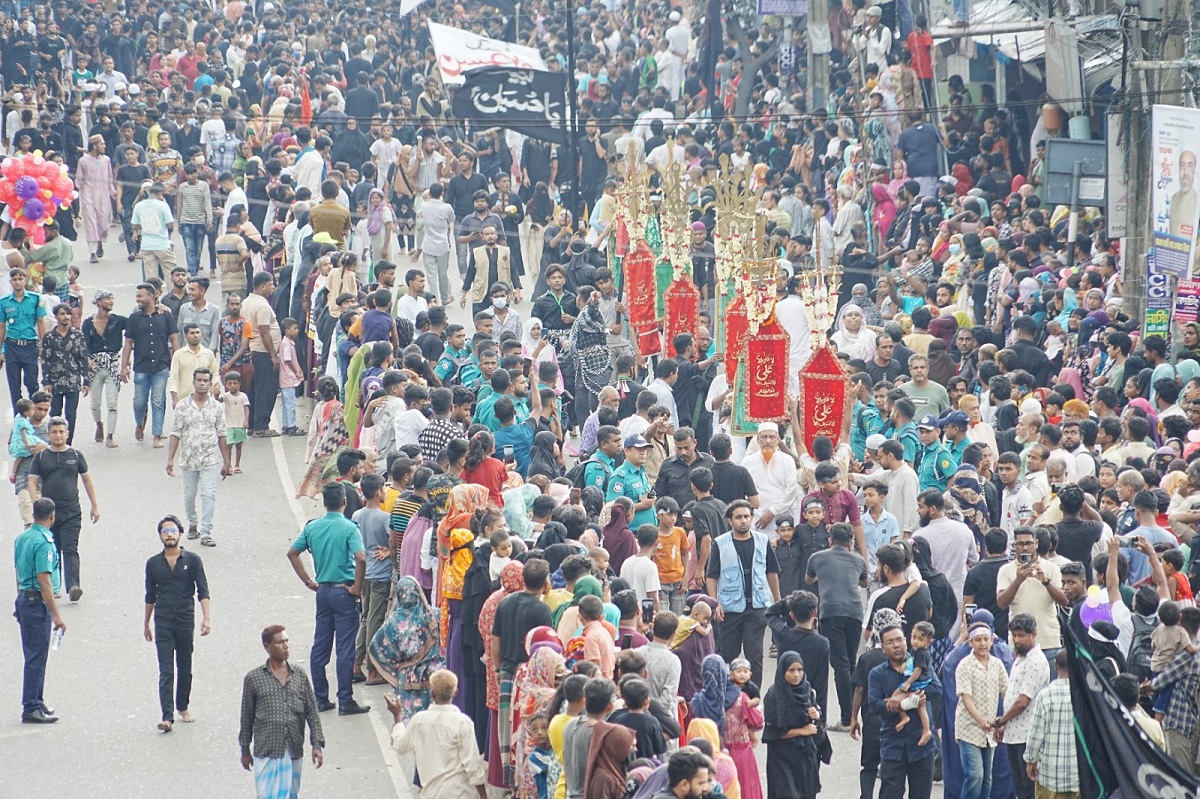 নিশ্ছিদ্র নিরাপত্তাবলয়ের মধ্য দিয়ে পবিত্র আশুরা উপলক্ষে রাজধানীতে শোকাবহ তাজিয়া মিছিল অনুষ্ঠিত হয়েছে। ভোর থেকেই কালো পোশাকে, হাতে লাল-কালো-সোনালি রঙের ঝান্ডা নিয়ে হোসনি দালানে জড়ো হন হাজারো নারী-পুরুষ। চারপাশজুড়ে ভেসে বেড়ায় ‘হায় হোসেন’, ‘হায় হোসেন’ শোকধ্বনি আর বুক চাপড়ানোর আওয়াজ। বিষণ্ন এক আবহ ছড়িয়ে পড়ে মিছিলজুড়ে।