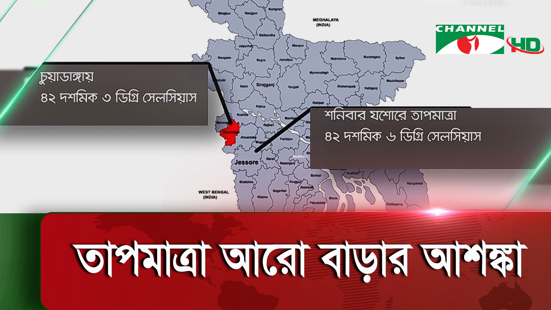 দশ বছরের ব্যবধানে দেশে তাপমাত্রা ৪২ডিগ্রি ছাড়িয়ে অতি তীব্র তাপ প্রবাহে আক্রান্ত প। অস্বস্তিকর গরমে অস্থির জনজীবন। শনিবার চলতি মৌসুমে সর্বোচ্চ তাপমাত্রা যশোরে ৪২ দশমিক ৬ ডিগ্রি সেলসিয়াস এবং চুয়াডাঙ্গায় ৪২ দশমিক ৩ ডিগ্রি রেকর্ড করা হয়। তাপমাত্রা আরো বাড়তে পারে এই আশঙ্কায় শুক্রবার সন্ধ্যা থেকে সোমবার পর্যন্ত ৭২ ঘন্টার সতর্কতা জারি করেছে আবহাওয়া অধিদপ্তর।