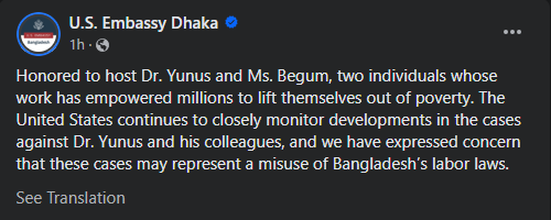 পোস্টে বলা হয়েছে, ড. ইউনূস এবং তার স্ত্রীকে এখানে পেয়ে সম্মানিত বোধ করছি, দুইজন ব্যক্তি যাদের কাজ লক্ষ লক্ষ মানুষকে দারিদ্র্যতা থেকে মুক্তি দিতে সক্ষম হয়েছে। যুক্তরাষ্ট্র ড. ইউনূস এবং তার সহকর্মীদের বিরুদ্ধে করা মামলাগুলোর ওপর ঘনিষ্ঠভাবে নজর রাখছে।