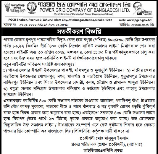 পিজিসিবির আইডিআরএনপিপির প্রকল্প পরিচালক প্রকৌশলী মো. মাসুদুল ইসলামের সই করা এই বিজ্ঞপ্তিতে বলা হয়, মঙ্গলবার বেলা ১১টা থেকে নবনির্মিত লাইনটি সার্বক্ষণিকভাবে চালু থাকবে। এ অবস্থায় নবনির্মিত ৪০০ কেভি সঞ্চালন লাইনের টাওয়ারে আরোহন, গবাদিপশু বাঁধা, টাওয়ারে রশি বেঁধে কাপড় শুকানো, লাইনের নিচে ও পাশে বাঁশঝাড় ও বড় গাছ রোপণসহ ঝুঁকিপূর্ণ কাজ থেকে বিরত থাকতে অনুরোধ করা হচ্ছে। একই সঙ্গে সবাইকে ৪০০ কেভি সঞ্চালন লাইন থেকে নিরাপদ (উভয় পাশে ২৩ মিটার) দূরত্বে থাকতে অনুরোধ করা হচ্ছে। উচ্চ ভোল্টেজের এই সঞ্চালন লাইন বা টাওয়ারের সংস্পর্শে এসে কেউ বিদ্যুতায়িত হলে পিজিসিবি কর্তৃপক্ষ দায়ী থাকবে না।