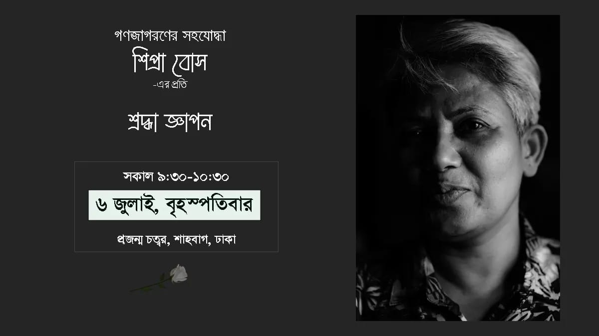 ৯০’ এর ছাত্র এবং গন অভুত্থানের সক্রিয়কর্মী শিপ্রা বোস এর প্রতি গণজাগরণের সহযোদ্ধারা শ্রদ্ধা জ্ঞাপন জানাবে। আগামী বৃহস্পতিবার ৬ জুলাই সকাল সাড়ে ৯টায় শাহবাগ প্রজন্ম চত্বরে তারা রাজপথের এই সক্রিয় সহযোদ্ধার প্রতি শ্রদ্ধা জ্ঞাপন করবেন বলে জানা গেছে।