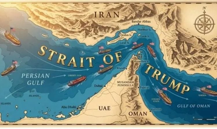 যুক্তরাষ্ট্রের প্রেসিডেন্ট ডোনাল্ড ট্রাম্প একটি মানচিত্র শেয়ার করেছেন, যেখানে হরমুজ প্রণালির নাম ‘স্ট্রেইট অফ ট্রাম্প’ বা ‘ট্রাম্প প্রণালি’ লেখা রয়েছে।