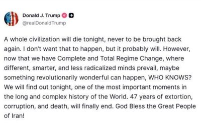 মঙ্গলবার ৭ এপ্রিল নিজের ভেরিফায়েড সামাজিক যোগাযোগমাধ্যম ট্রুথ সোশ্যাল-এ দেওয়া এক পোস্টে ট্রাম্প বলেন, ইরানের ৪৭ বছরের চাঁদাবাজি, দুর্নীতি ও মৃত্যুর অবসান ঘটবে। তথ্যটি জানিয়েছে আন্তর্জাতিক সংবাদমাধ্যম ভাস্কর ইংরেজি।