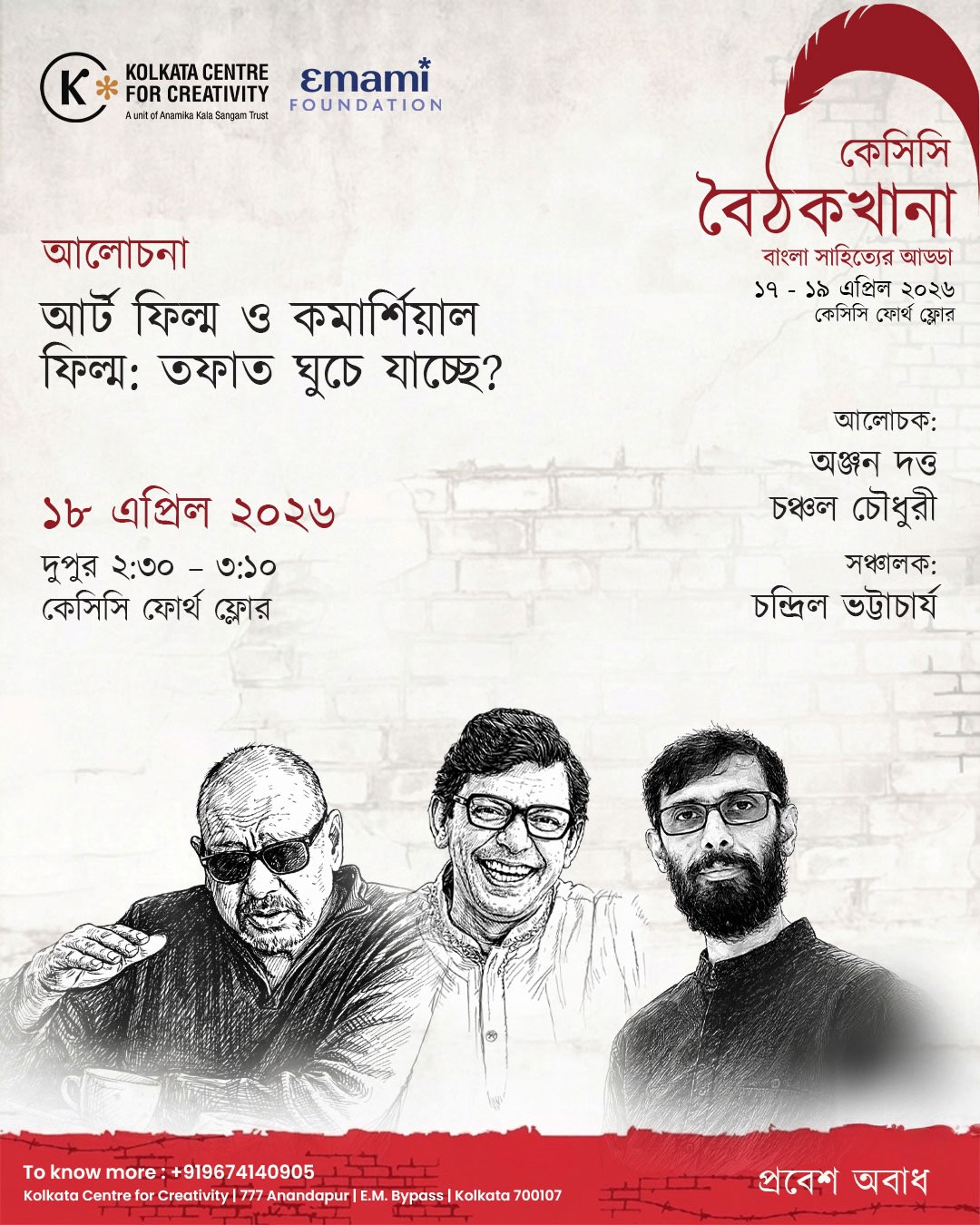 বাংলা সাহিত্য ও সংস্কৃতির জনপ্রিয় আড্ডা ‘কেসিসি বৈঠকখানা’র তৃতীয় আসর বসতে যাচ্ছে আগামী ১৮ এপ্রিল। কলকাতার আনন্দপুরে অবস্থিত কলকাতা সেন্টার ফর ক্রিয়েটিভিটি (কেসিসি) আয়োজিত এই অনুষ্ঠানে দুই বাংলার দুই প্রখ্যাত শিল্পী এক মঞ্চে হাজির হচ্ছেন।