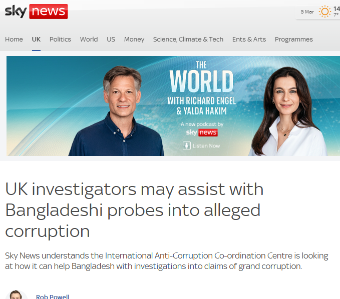 যুক্তরাজ্যের তদন্তকারীরা বাংলাদেশে রাজনৈতিক মহাদুর্নীতির তদন্তে সহায়তা করার সম্ভাবনা নিয়ে আলোচনা করছেন। আন্তর্জাতিক দুর্নীতি দমন সমন্বয় কেন্দ্র (আইএসিসিসি) বাংলাদেশের সরকার এবং আইন প্রয়োগকারী সংস্থাগুলোকে তদন্তে সহায়তা করার জন্য সুযোগ খুঁজছে বলে জানা গেছে।
