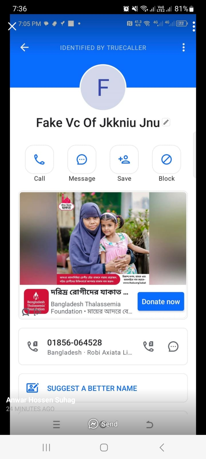 রবীন্দ্র বিশ্ববিদ্যলয়ের উপাচার্য প্রফেসর ডক্টর হাসান তালুকদার চ্যানেল আইকে জানিয়েছেন, ০১৮৫৬০৬৪৫২৮ নম্বর থেকে হোয়াটসআ্যপে তার পরিচিত বিভিন্ন জনের কাছে টাকা চাওয়া হয়েছে। অথচ এটা তার মোবাইল নম্বর নয়। পরিচিত জনের কাছে এজন্য বিব্রত হচ্ছেন তিনি।
