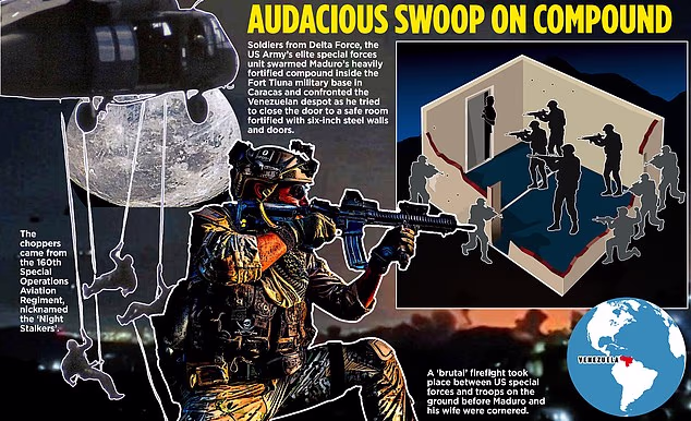 রাতের অন্ধকারে তারা রাডারের নিচ দিয়ে উড়ে মাদুরোর কম্পাউন্ডে পৌঁছায় এবং তাকে আত্মসমর্পণে বাধ্য করে।