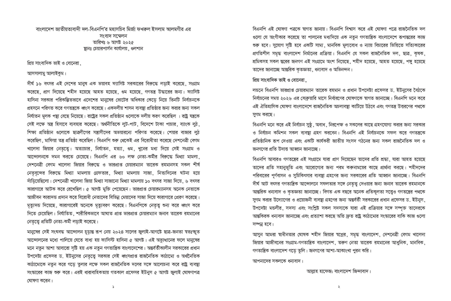 জুলাই ঘোষণাপত্র এবং অন্তর্বর্তী সরকারের প্রধান উপদেষ্টা ড. মুহাম্মদ ইউনূসের জাতির উদ্দেশে দেওয়া ভাষণ নিয়ে আনুষ্ঠানিক প্রতিক্রিয়া জানিয়েছে বাংলাদেশ জাতীয়তাবাদী দল (বিএনপি)। জুলাই ঘোষণাপত্র ও ড. ইউনূসের ভাষণকে স্বাগত জানিয়ে বিএনপির আশাবাদ, ফেব্রুয়ারিতে নির্বাচনের মাধ্যমে গণতন্ত্রের পথ সুগম হবে।