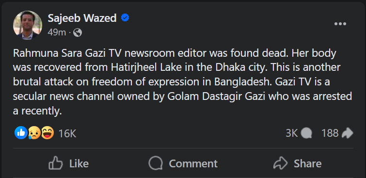 রাজধানীর হাতিরঝিল থেকে বেসরকারি টেলিভিশন চ্যানেল গাজী টিভির সাংবাদিক রাহানুমা সারার (৩২) লাশ উদ্ধার করা হয়েছে। আর এ ঘটনাকে বাংলাদেশে মতপ্রকাশের স্বাধীনতার ওপর হামলা উল্লেখ করে নিজের সামাজিক মাধ্যম ফেসবুকে একটি পোষ্ট দেন সাবেক প্রধানমন্ত্রী শেখ হাসিনার পুত্র সজীব ওয়াজেদ জয়।