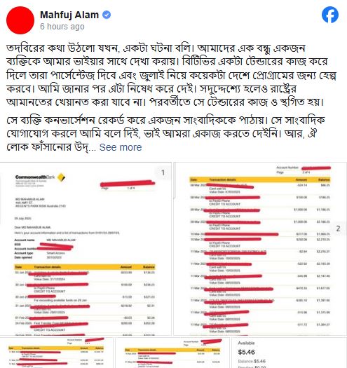 তথ্য উপদেষ্টা তার ভাই মাহবুব আলম মাহিরের যে পোস্টটি শেয়ার করেছেন তার শিরোনাম- ‘মিথ্যা অভিযোগের জবাব’। ওই পোস্টে মাহবুব আলম মাহির লিখেছেন, একটি ফেসবুক স্ট্যাটাস থেকে আমার বিরুদ্ধে আর্থিক অস্বচ্ছতার গুজব ছড়ানো হচ্ছে। আমার একাউন্টে গত ৬ মাসের বিবরণি এখানে দেয়া হল। আমার একাউন্টটি এখনো সচল আছে। বনি আমিন নামক ব্যক্তি ও কিছু মিডিয়ার প্রচারিত তথ্য আসলে মিথ্যা বৈ কিছু নয়। আমি অস্ট্রেলিয়ার একটি বিশ্ববিদ্যালয়ে মাস্টার্সের শিক্ষার্থী ছিলাম। অস্ট্রেলিয়ার একাউন্টটি ২৩ সাল থেকে খোলা।